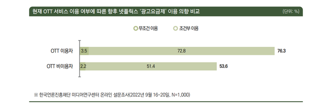 광고요금제에 대한 이 같은 경향은 OTT 이용자 전반에서 비슷하게 나타났다. ‘조건부 이용 의향’과 ‘무조건 이용 의향’ 비율을 OTT 구독여부에 따른 집단별로 살펴보면 ‘넷플릭스를 포함해 OTT 서비스를 하나라도 이용하고 있는 응답자’에선 각각 72.8%와 3.5%, ‘넷플릭스 외 OTT 서비스 이용자’에선 69.1%와 1.2%, OTT 비이용자들에선 51.4%와 2.2%였다. 언론재단은 이에 대해 “(광고배치와 요금책정 등에) 어떤 조건을 제시하는지가 이용자 규모를 결정짓는 데 관건이 될 것으로 보인다”면서 “넷플릭스에서 광고요금제의 조건을 설계할 때 OTT를 하나도 이용하고 있지 않은 사람보다는 이미 타 서비스를 이용 중인 사람들을 전환 내지 유입시킬 수 있는 방향으로 더 힘을 써야 할 수도 있음을 보여주는 결과”라고 분석했다.