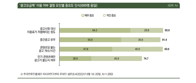 조건부 이용 의향자들에게 보다 구체적으로 광고요금제 이용을 결정하는 요인을 조사한 항목에선 ‘광고를 보는 대신 기존 이용료보다 얼마나 더 저렴해지는가’가 64.2%(‘매우 중요함’ 선택 기준)로 가장 중요하게 꼽혔다. ‘약간 중요함’까지 합친 긍정 응답 비율 합에서도 이 요인은 1위(93.9%)였다. ‘중간광고 유무, 즉 콘텐츠 내에 광고가 들어가는가’(55.9%), ‘콘텐츠 하나당 붙는 광고 개수 및 시간이 얼마나 되는가’(47.8%)가 뒤를 이었다. 반면 ‘인기 콘텐츠 위주로만 광고가 붙는가, 아니면 모든 콘텐츠에 다 동일하게 붙는가’는 28.9%(‘약간 중요함’까지 합쳤을 땐 74.7%)로 타 요인들 대비 중요도가 낮았다. 언론재단은 “이 결과만 놓고 보자면, 사람들이 넷플릭스의 광고요금제 이용 여부를 결정할 때 중간광고 유무가 콘텐츠 한 편에 붙는 광고의 전체 양보다 더 중요한 고려 요인일 수 있다”고 해석했다.