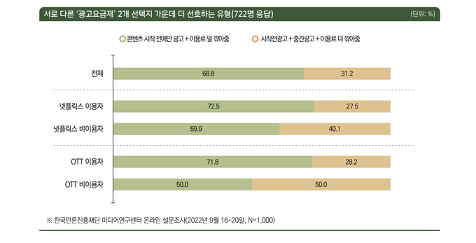 이와 비슷한 맥락에서 중간광고 도입은 광고요금제에 패착이 될 수 있는 요인이란 분석결과도 나왔다. 해당 요금제 이용 의향이 있는 응답자들에게 광고위치·형태 및 요금수준에 따른 이용의사를 물은 결과 ‘콘텐츠 시작 전에만 광고가 붙고 기존 요금제에서 좀 덜 깎아주는 광고 요금제’를 선택한 응답자가 68.8%로 가장 많았다. 이는 ‘콘텐츠 시작 전+중간중간 광고가 붙고 기존 요금제에서 더 많이 깎아주는 광고요금제’를 고른 응답자(31.2%)에 비해 2배가 넘는 수치였다. OTT 이용자 전반에서 비슷한 결과가 나타났다.