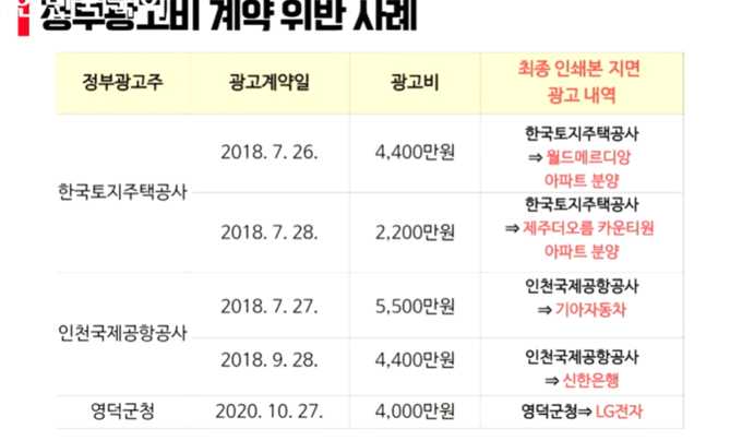 언론재단이 이 의원에게 제출한 자료에 따르면 광고비가 집행됐지만 실제로 지면에 실리지 못한 정부광고 사례는 총 371건이다. 지난 2018년 한국토지주택공사가 4400만원 광고비를 책정해 광고 계약을 했지만 최종 인쇄본 지면에는 월드메르디앙 아파트 분양 광고가 나왔고, 인천국제공항공사는 각각 5500만원, 4400만원의 광고 계약을 맺었지만 실제 지면에는 기아자동차, 신한은행의 광고가 게재됐다. 2020년 영덕군청은 4000만원의 광고를 집행했지만, 지면엔 LG전자 광고가 실렸다.