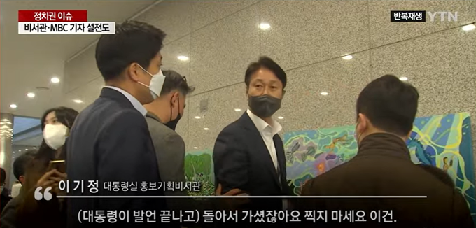 출근길 문답 말미에 MBC 기자가 집무실로 향하는 윤 대통령에게 “MBC가 뭐를 악의적으로 했다는 건가”라는 추가 질문을 하자 이기정 홍보기획비서관이 “가는 분한테 그렇게 이야기하면 예의가 아니지”라고 막아서며 설전이 벌어졌다.