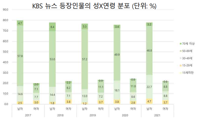 연령대별 등장 비중은 50~60대가 절반 이상을 차지했다. KBS 뉴스에 등장한 50~69세 비중은 2017년 57.8%, 2018년 53.0%, 2019년 57.2%, 2020년 49.9%, 2021년 46.8%로 집계됐다. 성별과 연령대를 교차분석하면 ‘KBS 뉴스의 주요 등장인물은 50~60대 남성’이라는 결론이 나온다.