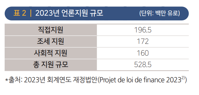 프랑스는 최근 몇 년 새 언론지원의 대상과 방식을 지속적으로 변화시켜온 가운데 2015년 지원대상을 확대했다. 정치 및 종합정보일간지 중심의 지원에서 그 대상을 모든 정기간행물, 지식과 학문을 보급하는 인터넷 매체로까지 넓힌 것. 배경엔 정치 및 종합정보 일간지 수의 지속적인 감소가 있었다. 언론사 창간이나 후원 혹은 특별한 이벤트를 위한 크라우드펀딩에 참여한 개인에 대한 소득세 감면(2015년), 언론의 혁신과 실험 지속을 돕는 신생매체 창업 및 혁신 지원 지금(2016년), 미디어교육 동참 언론사 지원(2019년), 효율적인 신문 배급 시스템 마련을 위한 법 개정(2019년) 등 변화하는 환경에 대응한 지원책이 마련됐다. 2023년 기준 프랑스 언론 지원액은 직·간접지원을 모두 합해 5억2850만유로(약 7285억원)에 달한다.