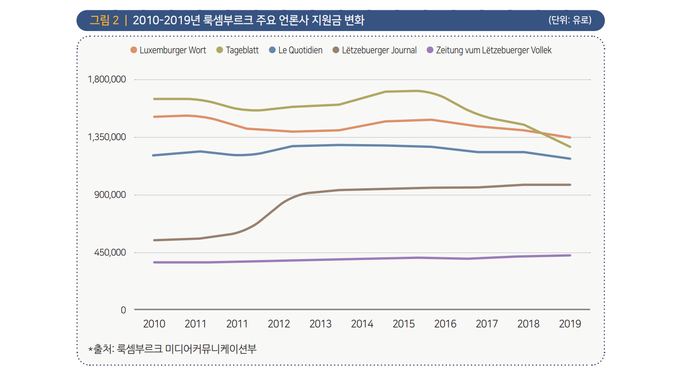 여기엔 “언론사에서 뉴스콘텐츠를 생산 및 편집하는 정규직에 해당하는 전문직 기자”에게 정부 보조금을 직접 지급하는 방식까지 포함됐다. 언론재단은 보고서에서 룩셈부르크 언론평의회 및 언론단체들의 반응을 전하며 “이번 개혁이 언론출판 간행물의 발행 방식, 비즈니스 모델, 발행 간격, 발행 언어 측면에서 언론지원대상을 크게 확장하고, 미디어에 종사하는 전문직 언론인의 작업에 가치를 부여한다는 점에서 의미가 있다는 입장”이라며 “다양한 저널리즘 행위자가 양질의 콘텐츠를 제공할 수 있는 토대를 제공해 정보 다원주의 수호에 일조할 것으로 여기는 것”이라고 적었다.