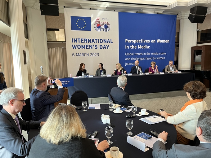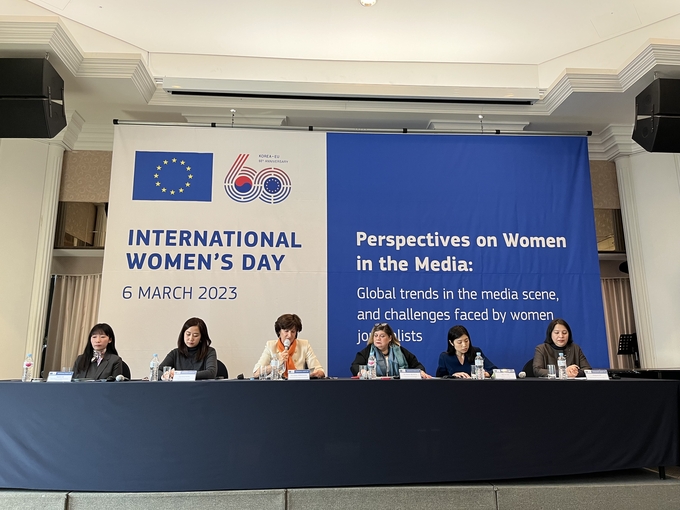 3·8 국제 여성의 날을 기념해 주한 유럽연합(EU) 대표부가 6일 ‘미디어 속 여성에 대한 관점’을 주제로 개최한 컨퍼런스에서 참가자들은 ‘여성’ 기자들이 온라인상 공격에서 더 손쉬운 표적이 되고 있다는 데 공감하며 이를 개인의 문제로 치부할 게 아니라 언론사 차원은 물론 언론 유관 단체들이 연대하고 협력해서 대응해야 한다고 목소리를 높였다.