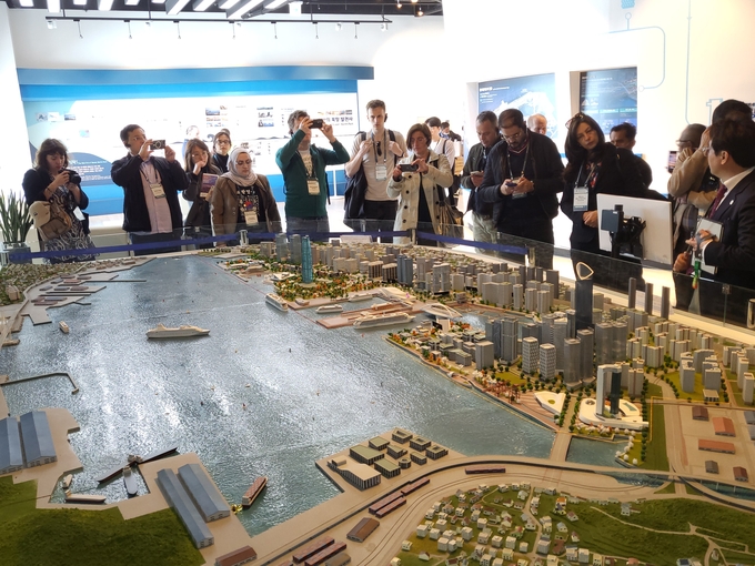 27일 한국기자협회 주최 ‘2023 세계기자대회’ 참가자들이 2030세계박람회 유치전에 뛰어든 부산을 찾았다. 50개국에서 온 70여명의 기자들은 세계박람회 후보지인 부산항 북항 일대를 둘러보며 부산의 세계박람회 유치 계획에 큰 관심을 나타냈다.