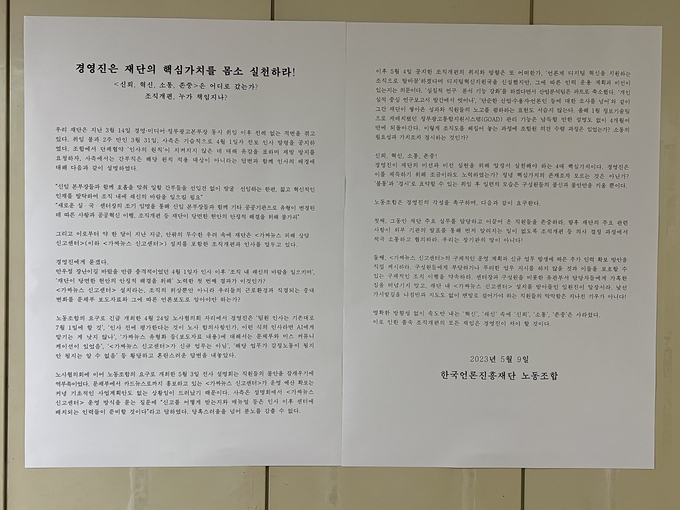 이 같은 센터 설치를 포함해 지난 3월 신임 경영·미디어·정부광고본부장이 동시 취임한 후 일방적으로 단행된 인사, 조직개편, 주요사안 의사결정 전반에 대해 노조는 심각한 우려를 표했다. 인사원칙이 지켜지지 않은 4월1일자 전보 인사, 의견수렴 과정이 없었던 5월4일 조직개편 공지 등 “소통의 필요성과 가치조차 경시”하는 행보에 대한 지적이다. 노조는 “‘가짜뉴스 신고센터’ 설치라는, 조직의 위상 뿐만 아니라 우리들의 근로환경과 직결되는 중대변화를 문체부 보도자료와 그에 따른 언론보도로 알아야만 하는가”라며 “향후 재단의 주요 관련 사항이 외부 기관의 발표를 통해 먼저 알려지는 일이 없도록 조직개편 등 의사결정 과정에서 적극 소통하고 협의하라”고 촉구했다.