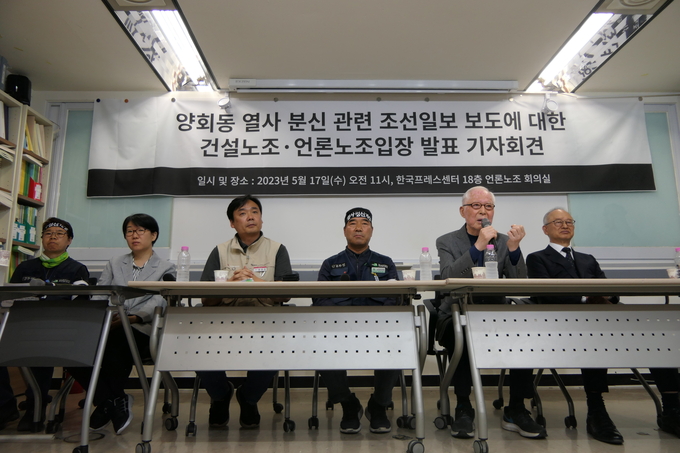 언론노조와 건설노조는 17일 오전 서울 중구 한국프레스센터 18층 언론노조 회의실에서 긴급 기자회견을 열어 지난 16~17일 조선닷컴과 조선일보 지면에 게재된 보도에 대해 반박했다. 조선일보는 '양 지대장이 지난 1일 노동절에 분신할 당시 현장에 있던 노조 간부 A씨가 말리지 않았다'는 취지의 보도를 CCTV 영상, 목격자 진술 등을 근거로 내놨다. 이에 대해 김준태 건설노조 교육선전국장은 “A씨는 열사의 분신을 말리려 했다. 양희동 열사는 목격자와 조우하기 전 이미 휘발성 물질을 자신의 몸과 주변에 뿌린 상황이었고 조우 당시엔 한 손에 라이터를, 다른 한 손엔 또 다른 휘발성 물질을 들고 있었다”며 “다가오지 말라는 경고에 따라 A씨는 섣부르게 접근할 수 없었고, 불의의 사고에 대비해 대화로 설득할 수밖에 없었던 상황”이라고 설명했다.