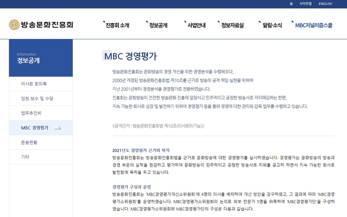 방문진은 앞서 지난해 9월 3명의 이사로 구성된 MBC 경영평가소위원회를 설치해 그해 12월 분야별 외부 전문가 5명을 위촉, 경영평가단을 구성했다. 경영평가단은 편성·제작, 보도·시사, 경영, 재무·회계, 방송인프라 등 5개 분야에 걸쳐 평가를 마친 뒤 지난 7일 방문진 이사회에 상정할 보고서를 확정했다. 보고서는 지난 8일 방문진 제11차 정기이사회에서 승인됐다.