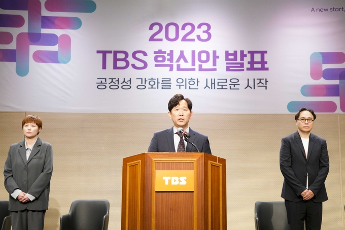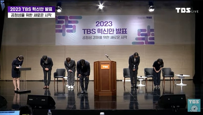 정태익 대표이사를 비롯한 TBS 경영진이 그간의 편향성 논란에 대해 시민에게 사과하며 고개를 숙였다. 12일 ‘공정성 강화를 위한 새로운 시작’이란 기치 아래 TBS 혁신안을 발표하는 자리에서다. 정태익 TBS 대표는 “저를 비롯한 TBS의 전 구성원들은 TBS가 다시는 이런 논란에 휘말리지 않도록 혁신하려고 한다”고 밝혔다.