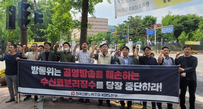 이날 강성원 KBS본부장은 “이미 헌법재판소와 대법원이 수신료 분리징수 재원의 합당성, 절차성 정당성을 인정하고 있는데도 이 정권의 언론탄압 폭주는 상상 이상”이라며 “방통위는 정당성을 인정받지 못하는 3인 체제에서 중차대한 수신료 분리징수 문제를 다루는 게 말이 안 된다. 시행 개정을 저지하는 순간까지 투쟁하겠다”고 말했다.