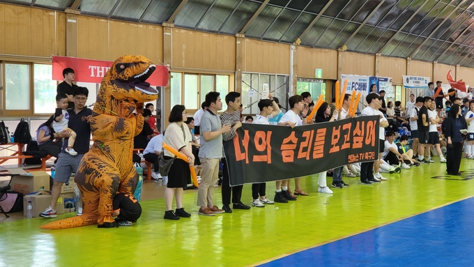 공룡탈을 입은 이재동 연합뉴스TV 기자는 “아들과 놀이터에서 놀 때 입었던 옷인데, 마침 회사 색깔과 똑같아 오늘 응원하기 위해 입고 왔다”며 “선수들이 일주일에 3일 이상 연습한 것으로 알고 있다. 예선전에서 지면 억울할 것 같고 적어도 4강은 갔으면 한다”고 기원했다.