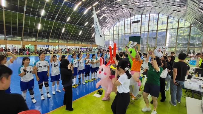 1일 경기 파주시 국가대표트레이닝센터(NFC)에서 열린 제1회 기자협회 여성회원 풋살대회. 이번 풋살대회는 강렬한 햇볕을 피해 실내 경기장에서 열렸지만 열정적인 응원으로 경기장은 그 어느 때보다 뜨거웠다. 응원단은 인형탈과 응원봉, 응원술을 활용해 열띤 응원전을 펼쳤고, 선수가 골을 넣을 땐 그야말로 경기장이 떠나가라 함성을 터뜨렸다.