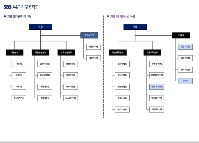 SBS 자회사인 SBS A&T는 6월30일 조직개편을 발표했다. 영상취재팀 등이 있던 보도영상본부와 영상제작팀(예능·드라마 영상 제작), 중계기술팀 등이 배치됐던 기술영상본부를 ‘방송제작본부’로 통합했고, 경영사업국을 본부 급인 ‘기획실’로 격상한 것이 주요 개편 내용이다. 이날 이동희 SBS A&T 대표이사 사장은 조직개편에 대한 담화문을 내어 “신속한 의사결정이 가능하게 하고 인력을 효율적으로 재배치”한다며 “수익사업의 확장을 위해 노력하겠다”고 밝혔다.