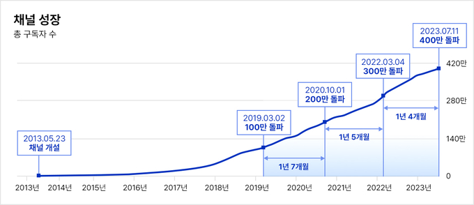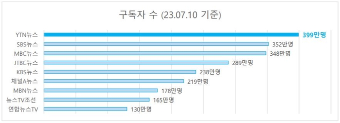 YTN은 최근 보도자료를 통해 지난 11일 유튜브 구독자 수 400만명을 기록했다고 밝혔다. 지난 2013년 5월23일 유튜브 채널을 개설한 YTN은 2019년 3월2일 구독자 수 100만명을 돌파했고, 1년 7개월 뒤인 2020년 10월1일에는 200만명을, 그로부터 1년 5개월 뒤인 2022년 3월4일에는 300만명의 구독자를 모았다.