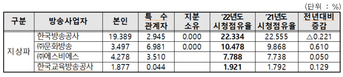 KBS 시청점유율이 전년 대비 0.221%p 감소한 것과 달리 MBC와 SBS, EBS의 시청점유율은 각각 0.610%p, 0.050%p, 0.129%p 상승했다. 지상파 4사의 시청점유율을 합산하면 2021년 41.953%에서 2022년(지난해) 42.521%로 0.568%p 상승했다.