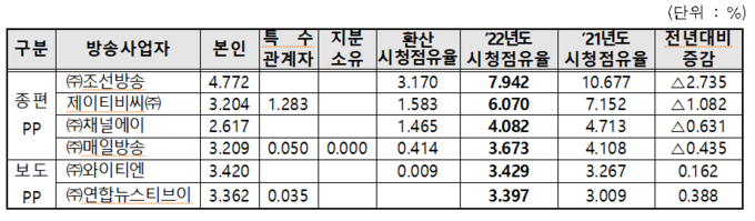 종편 4사 모두 전년보다 낮은 시청점유율을 기록했다. TV조선이 2.735%p 하락해 감소폭이 가장 컸고 JTBC, 채널A, MBN은 각각 1.082%p, 0.631%p, 0.435%p씩 떨어졌다. 종편 4사의 시청점유율을 합산하면 2021년 26.65%에서 지난해 21.767%로 4.883%p 감소했다.