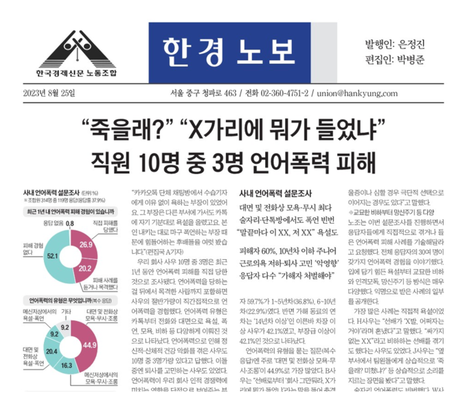 한국경제 노동조합이 지난달 7~18일 전체 조합원을 대상으로 언어폭력 실태를 살핀 설문조사를 진행한 결과 ‘최근 1년 내 언어폭력 피해 경험이 있냐’는 질문에 47.1%가 직·간접적 피해경험을 호소한 것으로 나타났다. 전체 318명 조합원 중 119명이 참여(응답률 37.9%)한 설문에서 ‘직접 피해를 봤다’는 응답이 26.9%, ‘피해 사례를 듣거나 목격했다’가 20.2%였다. 피해경험이 없다는 답은 52.1%였다.