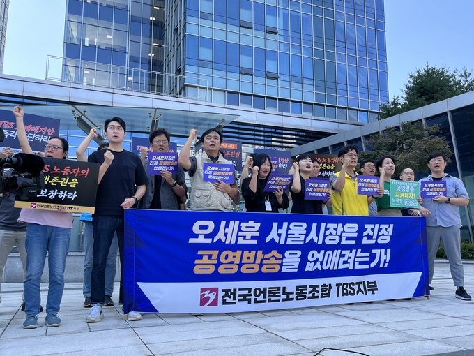 조례 무효확인 소송 첫번째 변론기일이 열린 이날 TBS지부는 행정법원 앞에서 기자회견을 열어 TBS 지원 폐지 조례 통과와 서울시의 예산삭감으로 제작 마비 상황에 이른 TBS 사태는 오세훈 서울시장에서 비롯됐다며 오 시장이 직접 사태 해결에 나서야 한다고 목소리를 높였다.