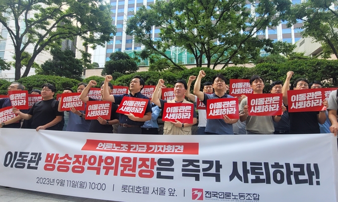 이호찬 전국언론노조 MBC본부장은 “이명박 정부 시절 방송장악의 기술자라고 불렸던 이동관이 15년 만에 컴백하면서 도망가는 기술마저 진화했나 보다”며 “일국의 방송통신위원장이 방송통신 종사자들의 목소리 하나 듣지 않고 저렇게 도망치는 것이 2023년 대한민국의 현실”이라고 지적했다.