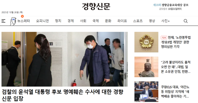경향신문은 26일 자사 웹사이트에 <검찰의 윤석열 대통령 후보 명예훼손 수사에 대한 경향신문 입장> 제하의 입장문을 게재해 “해당 기사들이 검찰 주장대로 고의에 의한 허위 보도인지, 팩트에 근거한 합리적 문제제기인지는 차후 가려질 것”이라며 “경향신문은 앞으로도 권력 감시·비판이라는 언론 본연의 역할에 한 치의 소홀함도 없을 것임을 더불어 밝힌다”고 했다.
