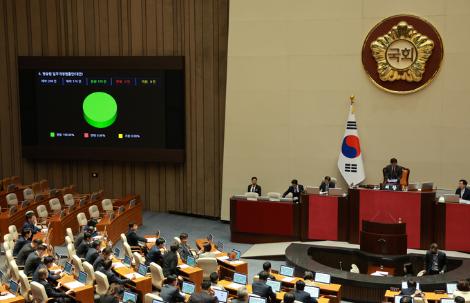더불어민주당 등 야당은 이날 본회의에서 노란봉투법 및 방송3법 개정안을 상정하고 재석 의원 만장일치로 통과시켰다. 구체적으로 방송법과 한국교육방송공사법 개정안은 재석 176명 만장일치로, 방송문화진흥회법 개정안은 재석 175명 만장일치로 통과시켰다. 이날 ‘필리버스터(무제한 토론)’를 예고했던 국민의힘은 법안 상정 직전 이를 철회하고 본회의장에서 퇴장했다.