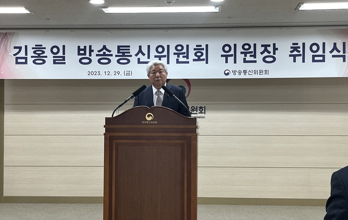 윤석열 대통령의 ‘검사 선배’ 김홍일 방송통신위원장이 임명 당일 바로 취임식을 열고 공식 업무를 시작했다. 취임사에선 ‘공영방송 혁신’ ‘가짜뉴스 대응’ ‘포털의 사회적 책임 강화’ 등을 밝혔다.