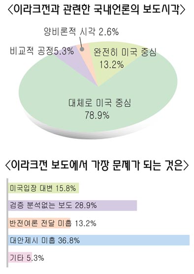 국내 언론의 이라크전 보도 시각과 태도에 대해서는 응답자 38명 가운데 78.9%(30명)가 ‘과거에 비해 완화되기는 했지만 대체로 미국 중심적 시각’이라고 답했고, ‘완전히 미국 중심적인 시각’이라는 답변도 13.2%(5명)로 집계됐다. ‘비교적 공정한 시각을 유지하고 있다’는 의견은 5.3%(2명)에 그쳤다.