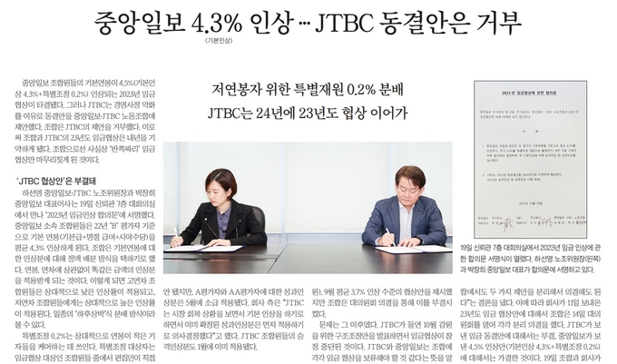 다만 중앙일보와 달리 JTBC 임금 협상은 불발됐다. 경영사정 악화를 이유로 사측이 노조에 동결안을 제안했고 조합이 이를 거부한 데 따른 것이다. 이로써 JTBC 2023년 임협은 올해로 넘어오게 됐다.