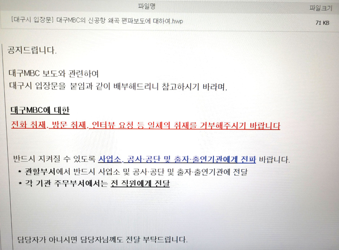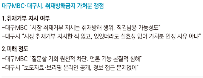 대구시는 대구MBC가 지난해 4월 ‘TK통합신공항의 중장거리 노선 운항이 불가능하다’고 왜곡보도했다며 대구MBC 취재진의 시청사 출입을 막고 소방서를 포함해 출자·출연기관 등 모든 산하기관에 취재질의 답변과 자료 제공, 촬영을 금지했다.
