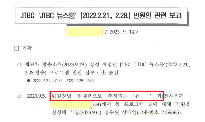 류 위원장은 19일 한겨레와 인터뷰에서 가족이 민원을 제기했다는 보고를 받고도 이해충돌 회피를 하지 않았다는 내부 지적에 대해 "그런 보고를 받은 사실이 없다"고 말했다. 하지만 방심위 노조는 지난해 9월 직원이 류 위원장에게 보고한 자료를 공개하며 거짓말이라고 주장했다.