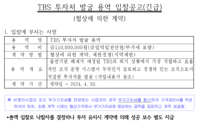 TBS는 15일 ‘TBS 투자자 발굴 용역’ 입찰공고를 내고 “출연기관 해제가 예정된 TBS의 위기 상황에서 가장 적합하고 효율적인 조직 운영 시스템이 무엇인지 검토하고 경쟁력 있는 조직으로서 적절한 투자처를 발굴”한다고 밝혔다. 전날(14일) TBS는 보도자료를 통해 “안정적인 재원 구조 확보를 위해”서라며 용역 추진 사실을 알린 바 있다.