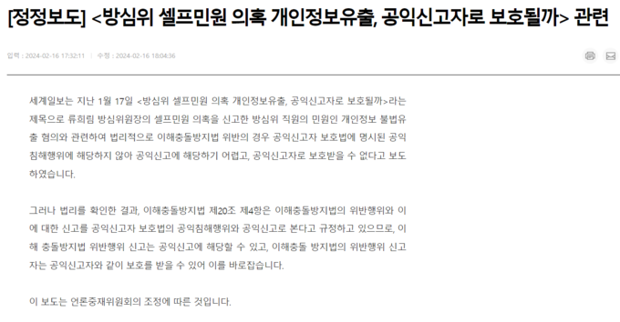 세계일보는 “이해충돌방지법의 위반행위 신고자는 공익신고자와 같이 보호를 받을 수 있다”는 정정보도문을 언론중재위원회 조정이 이뤄진 16일 당일 홈페이지에 게재했다. 방심위 노조는 지난달 29일 정정보도를 신청했다. 손해배상 1000여만원 신청은 취하했다.