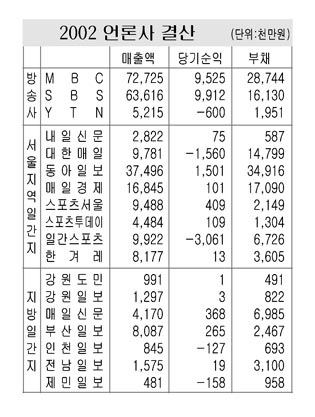 동아일보는 2001년 568억원의 적자에서 2002년에는 150억원의 흑자를 기록했다. 매출액은 전년 보다 592억원이 늘었으며 부채는 373억원이 줄었다. 한겨레도 2001년 39억원 적자에서 지난해 1억여원의 흑자를 기록했다. 한겨레 역시 매출액은 105억원이 늘었으며 부채는 78억원이 감소했다. 내일신문과 매일경제는 2001년 각각 15억원, 5억원 2002년 7억원, 10억원의 흑자기조를 유지했다. 내일신문은 2001년 66.6%에 이어 지난해에도 32.3%의 매출액 증가율을 기록해 서울지역에서 가장 높은성장세를보였다.