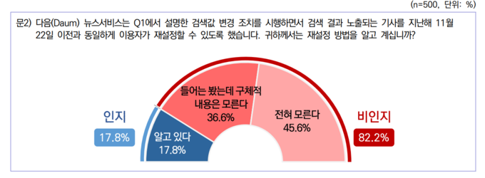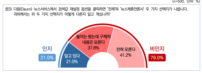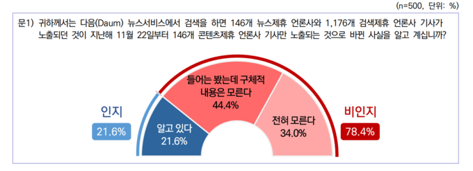 한국인터넷신문협회(인신협)와 회원사를 주축으로 한 포털불공정행위근절 범언론대책위원회(범대위)의 의뢰로 여론조사전문업체 서던포스트가 2월20~22일 다음 뉴스 이용자를 대상으로 실시한 조사결과 ‘지난해 11월22일부터 다음에서 뉴스검색 시 기본으로 노출되는 매체에서 1176개 검색제휴 언론사가 배제된 사실을 아냐’는 질문에 78.4%가 인지하고 있지 못하다는 응답을 했다. ‘전혀 모른다’, ‘들어는 봤는데 구체적 내용은 모른다’가 각각 34.0%, 44.4%였고, ‘알고 있다’는 답은 21.6%에 그쳤다.