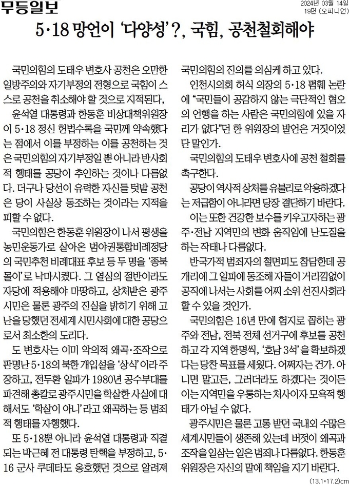 반면 무등일보는 14일자 사설에서 도태우 변호사 공천 철회를 촉구했다. 무등일보는 사설에서 “도 변호사는 이미 악의적 왜곡·조작으로 판명난 5·18의 북한 개입설을 ‘상식’이라 주장하고, 전두환 일파가 1980년 공수부대를 파견해 총칼로 광주시민을 학살한 사실에 대해서도 ‘학살이 아니’라고 왜곡하는 등 범죄적 행태를 자행했다”고 주장했다.