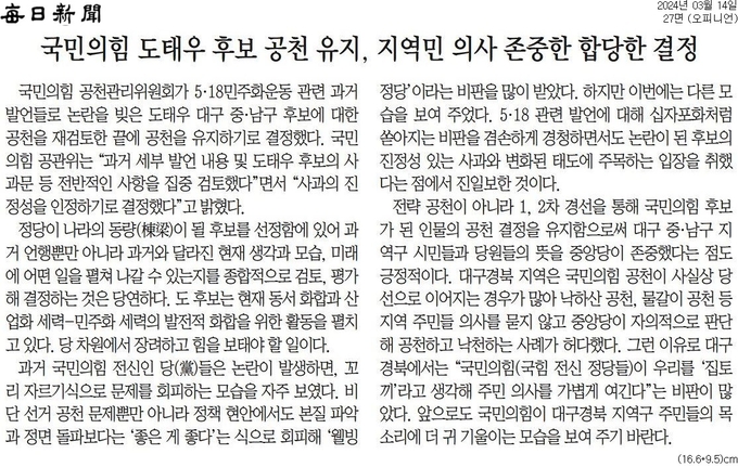 매일신문은 14일자 사설에서 “공관위의 도태우 후보 공천 유지는 합당한 결정”이라고 했다. 이 사설은 도 후보의 공천 유지에 대해 “5·18 관련 발언에 대해 십자포화처럼 쏟아지는 비판을 겸손하게 경청하면서 논란이 된 후보의 진정성 있는 사과와 변화된 태도에 주목하는 입장을 취했다는 점에서 진일보한 것”이라고 평가했다.