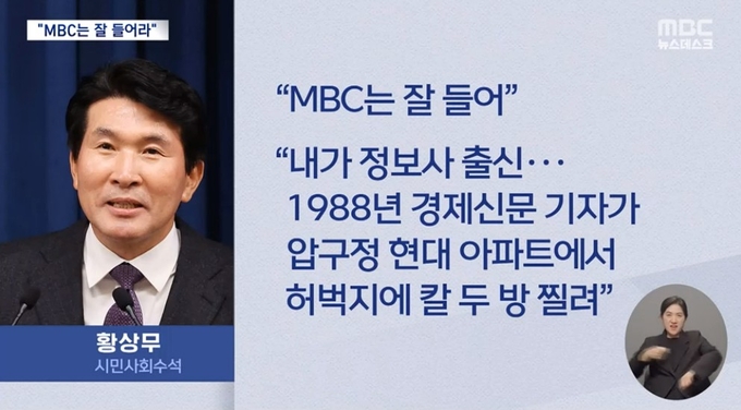 이어 “윤석열 정권 출범 이후 MBC 기자들은 정권 비판적 보도나 권력의 감시자 역할을 수행할 때마다 극우세력들의 좌표로 찍히며 온갖 협박에 노출돼왔다”며 “황 수석이 이 같은 기자들의 트라우마를 모를 리가 없다. 그래서 우리는 이를 결코 농담으로 받아들일 수 없다”고 밝혔다.