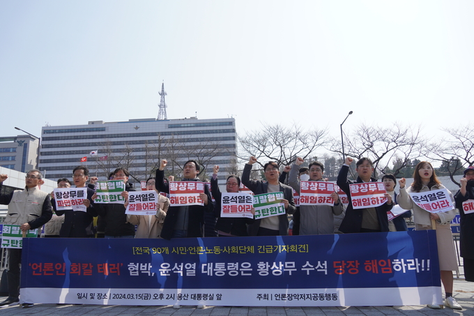 이날 전국 90개 시민·언론·노동·사회단체들로 구성된 언론장악저지공동행동도 서울 용산구 대통령실 앞에서 긴급 기자회견을 열고 황 수석의 해임을 촉구했다.