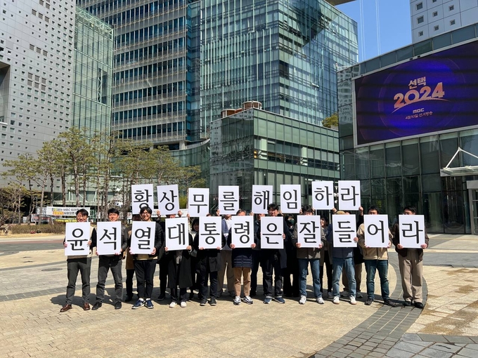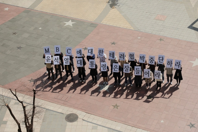 전국언론노조 MBC본부 조합원들은 18일 오후 서울 마포구 MBC 사옥 내·외부에서 ‘윤석열 대통령은 잘 들어라 황상무를 해임하라’와 ‘윤석열 대통령은 잘 들어라 MBC에 대한 테러 협박 중단하라’가 쓰인 피켓을 들고 플래시몹을 진행했다.