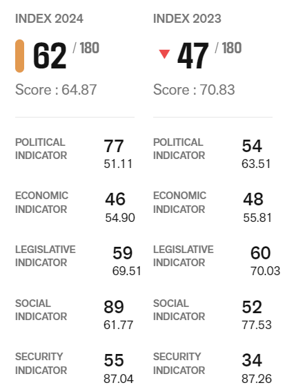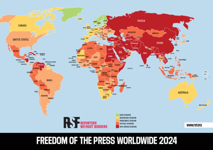 국경없는기자회는 3일 2024년 세계 언론자유지수 평가 결과를 발표했는데, 한국은 지난해 47위에서 올해 62위로 15계단이나 하락한 것으로 나타났다. 윤석열 정부가 출범한 2022년 43위였던 한국의 언론자유지수는 이듬해 47위로 하락했는데, 1년 만에 60위권까지 떨어진 것이다.