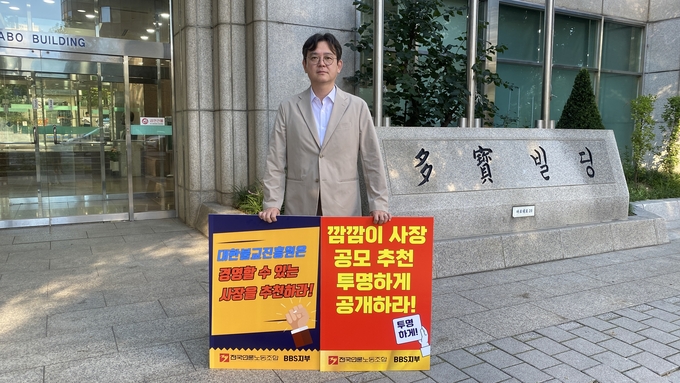 BBS불교방송 사장 공모가 진행 중인 가운데 전국언론노조 BBS지부가 사장 후보를 추천하는 대한불교진흥원을 상대로 1인 시위에 들어갔다. 노조는 추천 과정의 문제점을 지적하며 절차의 투명한 공개, 나이 제한 폐지, 내부 인사 선임 등을 요구하고 있다.