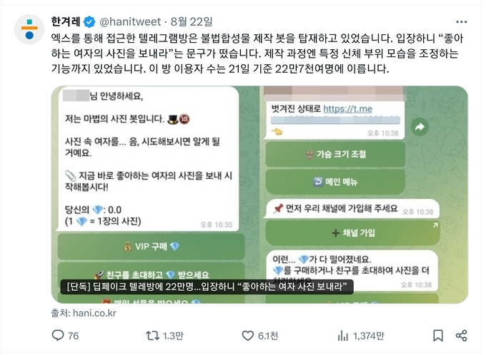 한겨레가 X에 올린 <딥페이크 텔레방에 22만명…입장하니 “좋아하는 여자 사진 보내라”>가 24일 기준 타임라인 노출 수 1374만 회를 기록했다. 보도 당일인 8월22일 게시돼 첫날 4만여명에게만 노출됐다가 사흘 동안 227만명으로 늘더니 닷새 만에 1300만명을 넘었다.