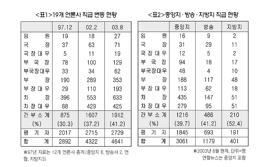 2003년 8월 현재 언론사 간부비율은 평균 41.2%로 지난해에 비해 4.0% 증가했다. ‘위는 늘고 아래는 줄어드는’ 조직 형태가 점차 고착화되는게 아니냐는 우려가 높아지고 있다.