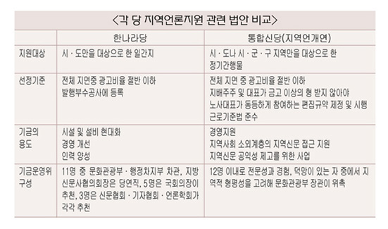 양당의 법안은 먼저 지원대상에서 확연한 차이를 보이고 있다. 통합신당안이 △시·도뿐 아니라 시·군·구 지역을 대상으로 한 주간지 등 지역언론에까지 지원범위를 넓힌 것과는 달리 한나라당안은 △시·도를 대상으로 발행되는 일간지만을 지원대상으로 규정하고 있다. 또 선정기준과 관련해서도 통합신당안이 △광고비중이 전체 지면의 50% 이하로 △지배주주와 대표가 언론사 운영과 관련, 벌금·금고 이상의 형을 받지 않고 △노사 동수가 제정한 편집규약을 시행하고 있으며 △근로기준법을 준수해야 한다는 내용 등 편집 자율성 관련 내용이 포함된 반면, 한나라당안은 △광고 비중 50% 이하 △발행부수공사(ABC) 등록 등의 조항만 적시돼있을 뿐 구체적인 선정기준이 없다.