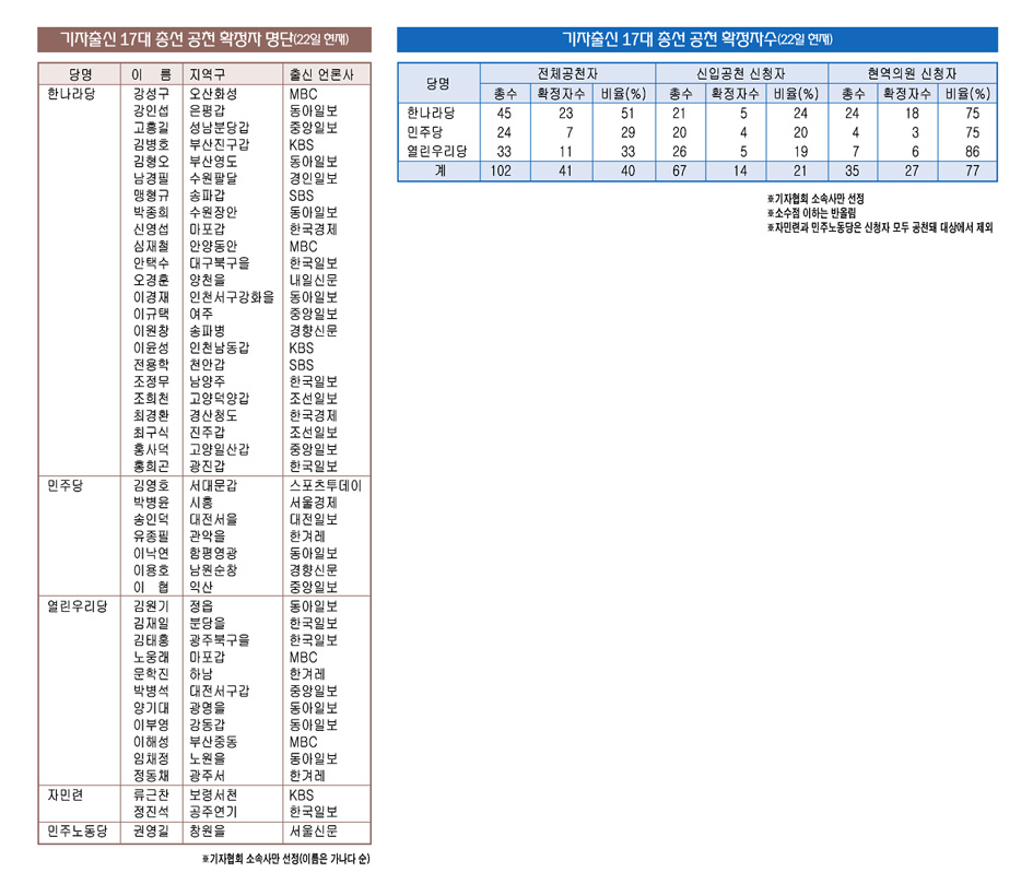 17대 총선을 25일 앞둔 22일 현재 기자출신 총선출마자들 가운데 공천을 받은 사람보다 공천에서 탈락한 후보자가 더 많은 것으로 나타났다. 또한 기자출신 정치신인보다 기자출신 현역의원들의 공천확률이 3배나 높았다.