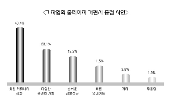 기자협회 임원들은 기협 홈페이지 개편시 회원커뮤니티 강화에 가장 역점을 둬야할 것으로 생각하고 있다. 또 기자협회보 제호 변경에 관해서는 찬반 양측의 의견이 팽팽했다.