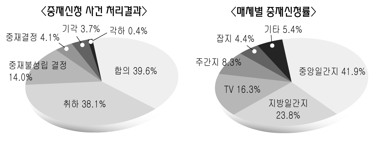 언론중재위가 3월 30일 발간한 ‘2003년도 연차보고서’에 따르면 지난 한 해 동안 언론 피해 관련 중재신청 건수는 총 7백24건이었다. 전년에 비해 2백13건의 급증세를 보였다. 중재신청 사안은 당사자간 합의가 2백87건(39.6%), 취하 2백76건(38.1%), 중재불성립 결정(14.1%), 중재결정 30건(4.1%) 등이 중재위에 의해 처리됐다.