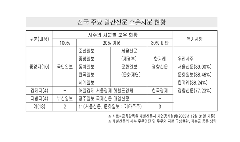 이 발표에 따르면 사주의 소유지분이 30% 이상인 중앙일간지는 국민 동아 세계 조선 중앙 한국일보 등 모두 6개사이다. 또한 경제지는 매일 서울 헤럴드경제 등 3개지, 지방지는 조사대상인 광주일보 국제신문 부산일보 매일신문 등 4개사가 전부 해당됐다.