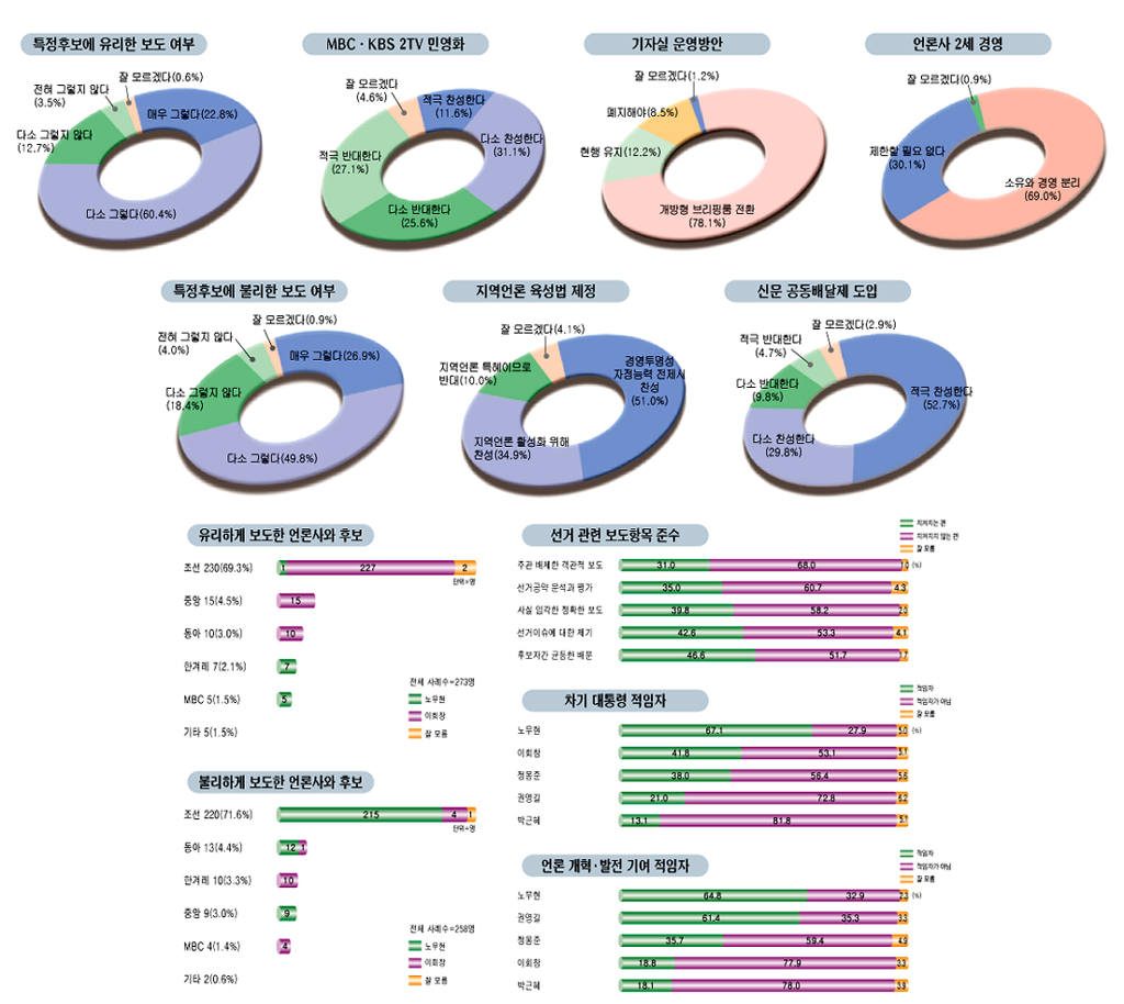 최근 논란이 되고 있는 언론사의 사설 등을 통한 특정 후보 공개지지 문제에 대해서는 60.0%가 음성적인 편들기를 막을 수 있으므로 찬성한다고 응답한 반면, 언론과 정치권의 유착이나 편파보도를 심화시킬 수 있으므로 반대한다가 39.2%로 찬성 의견이 우세했다. 찬성한다는 의견은 방송사(71.1%)가 신문사(57.5%)보다 높게 나타났다.